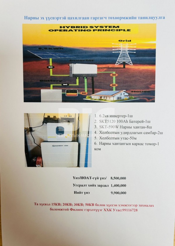 Нарны эх үүсвэртэй цахилгаан гаргагч төхөөрөмж-/6.2КВТ/